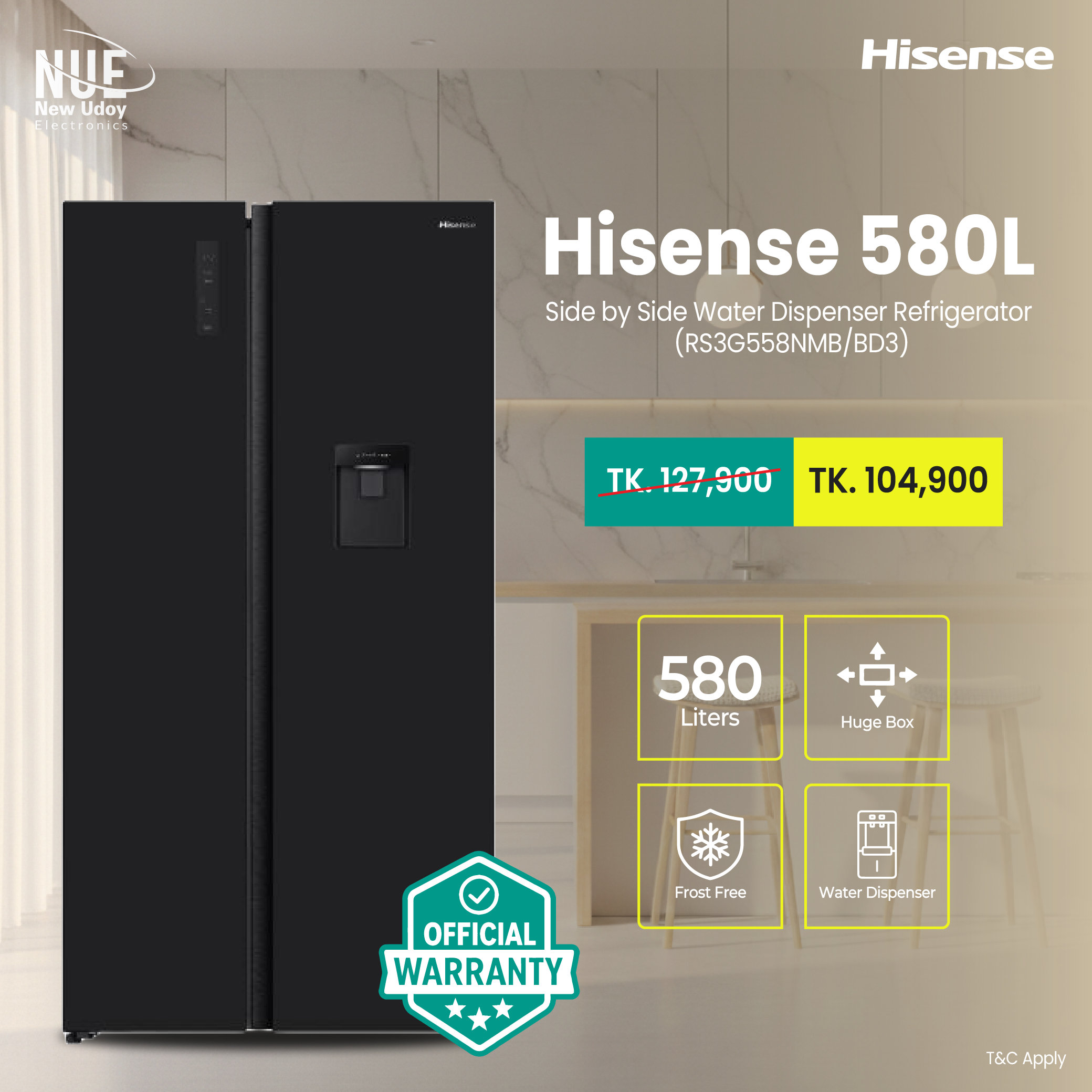 Buy Hisense 580L Side by Side Refrigerator with Water Dispenser (RS3G558NMB/BD3) in Bangladesh. Frost free cooling, huge capacity and official warranty available at New Udoy Electronics.