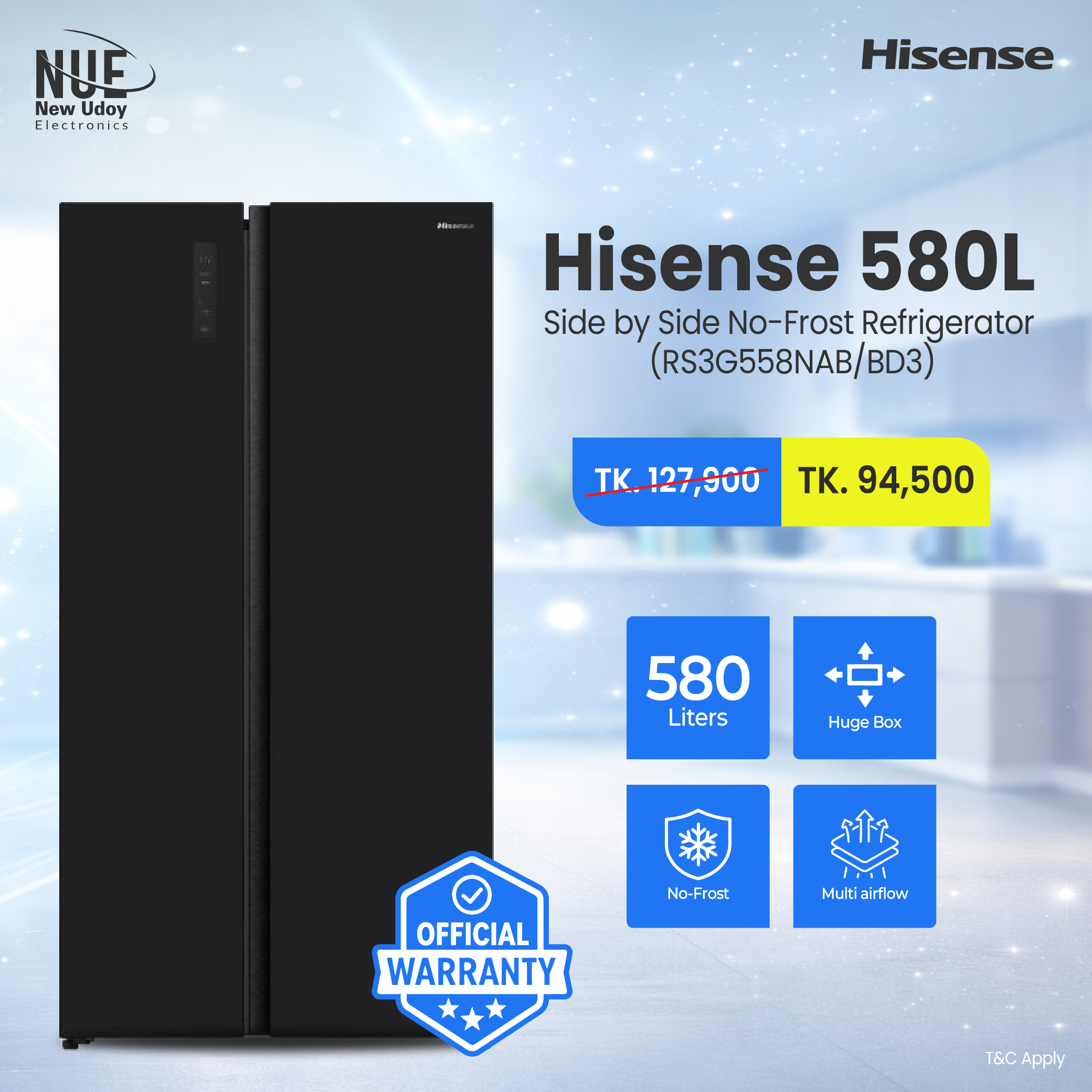Buy Hisense 580L Side by Side No-Frost Refrigerator (RS3G558NAB/BD3) in Bangladesh. Huge capacity, multi airflow cooling and official warranty available at New Udoy Electronics.👉 Large capacity এবং price-to-performance দিক থেকে Hisense সবচেয়ে practical choice