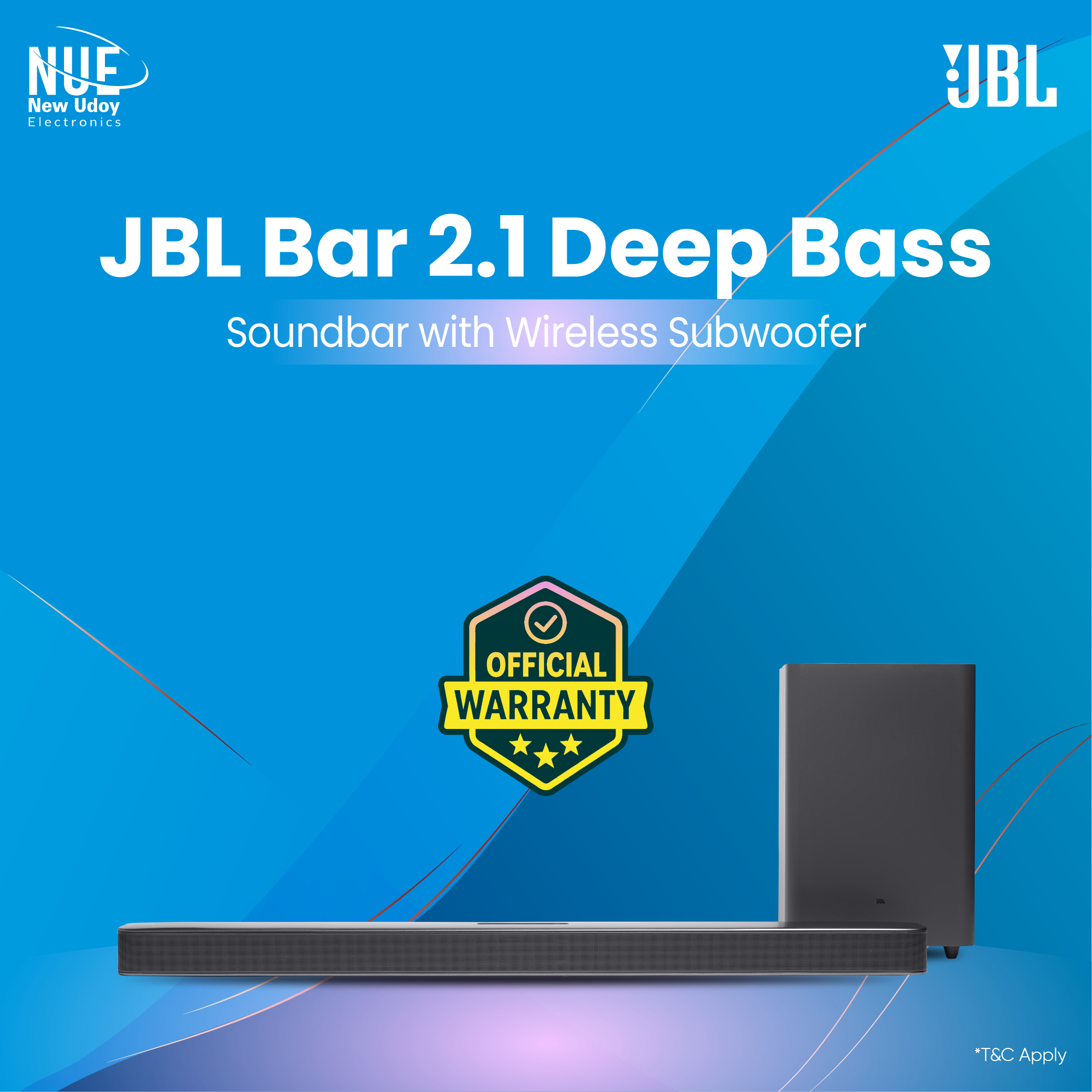 Buy JBL Bar 2.1 Deep Bass Soundbar in Bangladesh with powerful wireless subwoofer and cinematic sound. 100% original product with warranty from New Udoy Electronics.